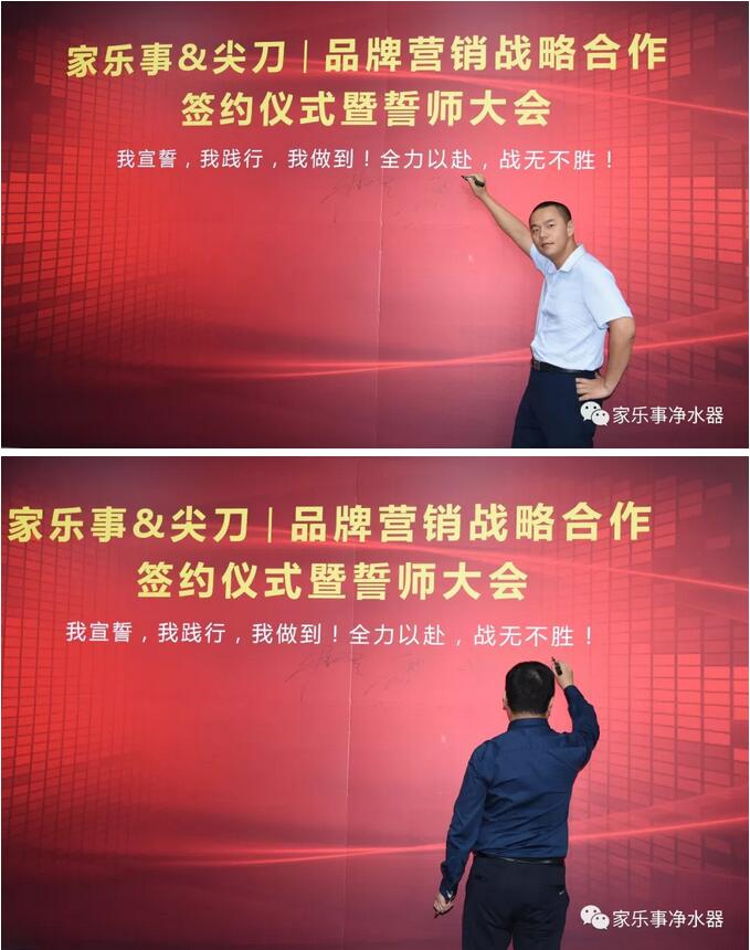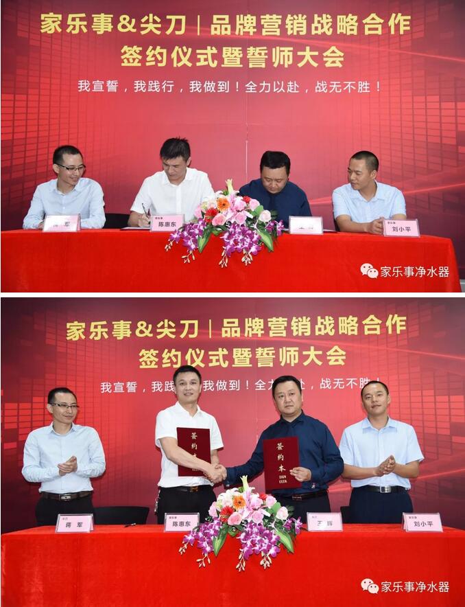 2019年7月26日,家樂(lè)事5S凈水器品牌與尖刀營(yíng)銷戰(zhàn)略合作簽約儀式暨誓師大會(huì)在家樂(lè)事總部隆重舉行。家樂(lè)事董事長(zhǎng)陳惠東先生、總經(jīng)理劉小平先生、副總經(jīng)理劉敬軍先生、尖刀營(yíng)銷總經(jīng)理王輝先生親自出席簽約儀式,雙方簽署戰(zhàn)略合作協(xié)議,將圍繞家樂(lè)事品牌戰(zhàn)略升級(jí)展開(kāi)深度合作。