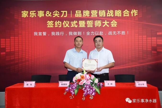 2019年7月26日,家樂(lè)事5S凈水器品牌與尖刀營(yíng)銷戰(zhàn)略合作簽約儀式暨誓師大會(huì)在家樂(lè)事總部隆重舉行。家樂(lè)事董事長(zhǎng)陳惠東先生、總經(jīng)理劉小平先生、副總經(jīng)理劉敬軍先生、尖刀營(yíng)銷總經(jīng)理王輝先生親自出席簽約儀式,雙方簽署戰(zhàn)略合作協(xié)議,將圍繞家樂(lè)事品牌戰(zhàn)略升級(jí)展開(kāi)深度合作。