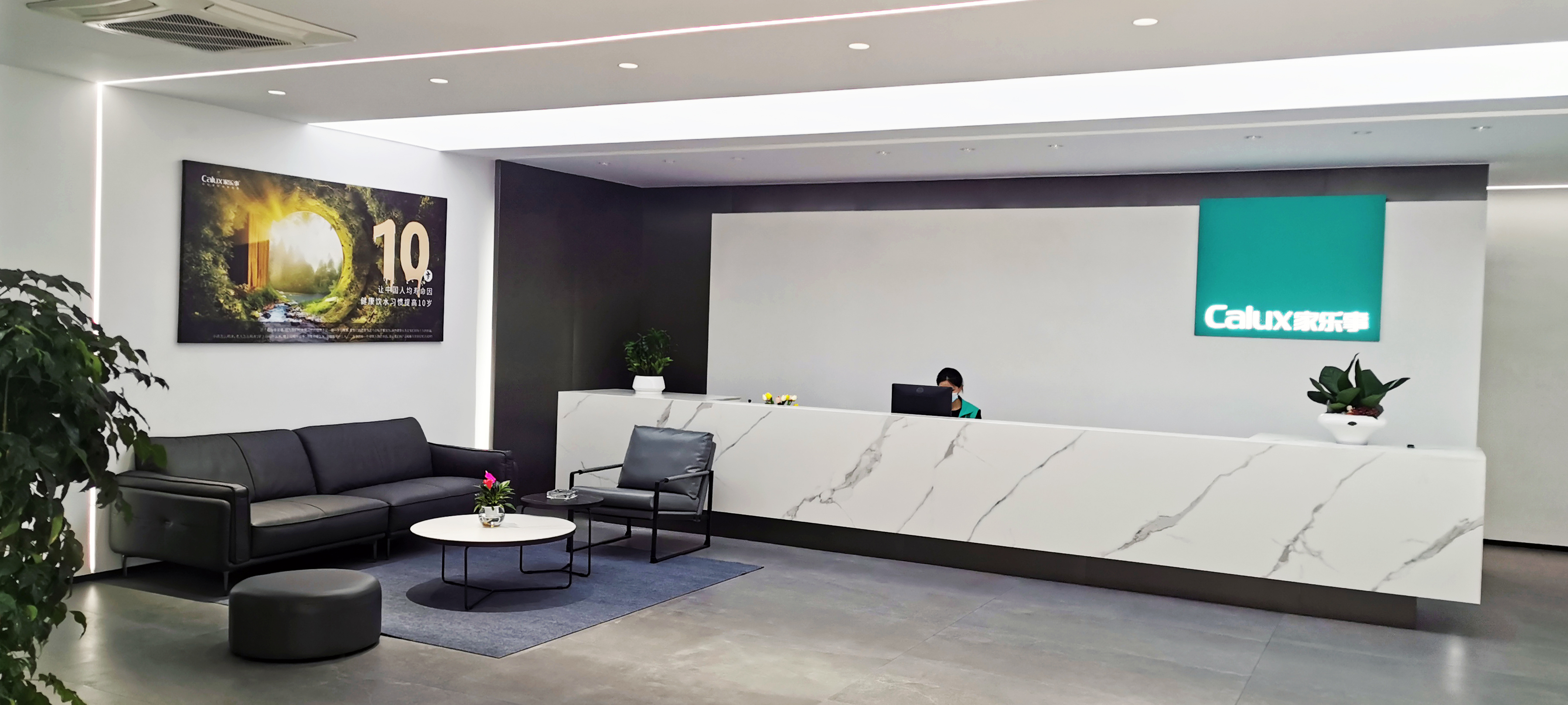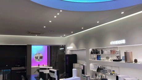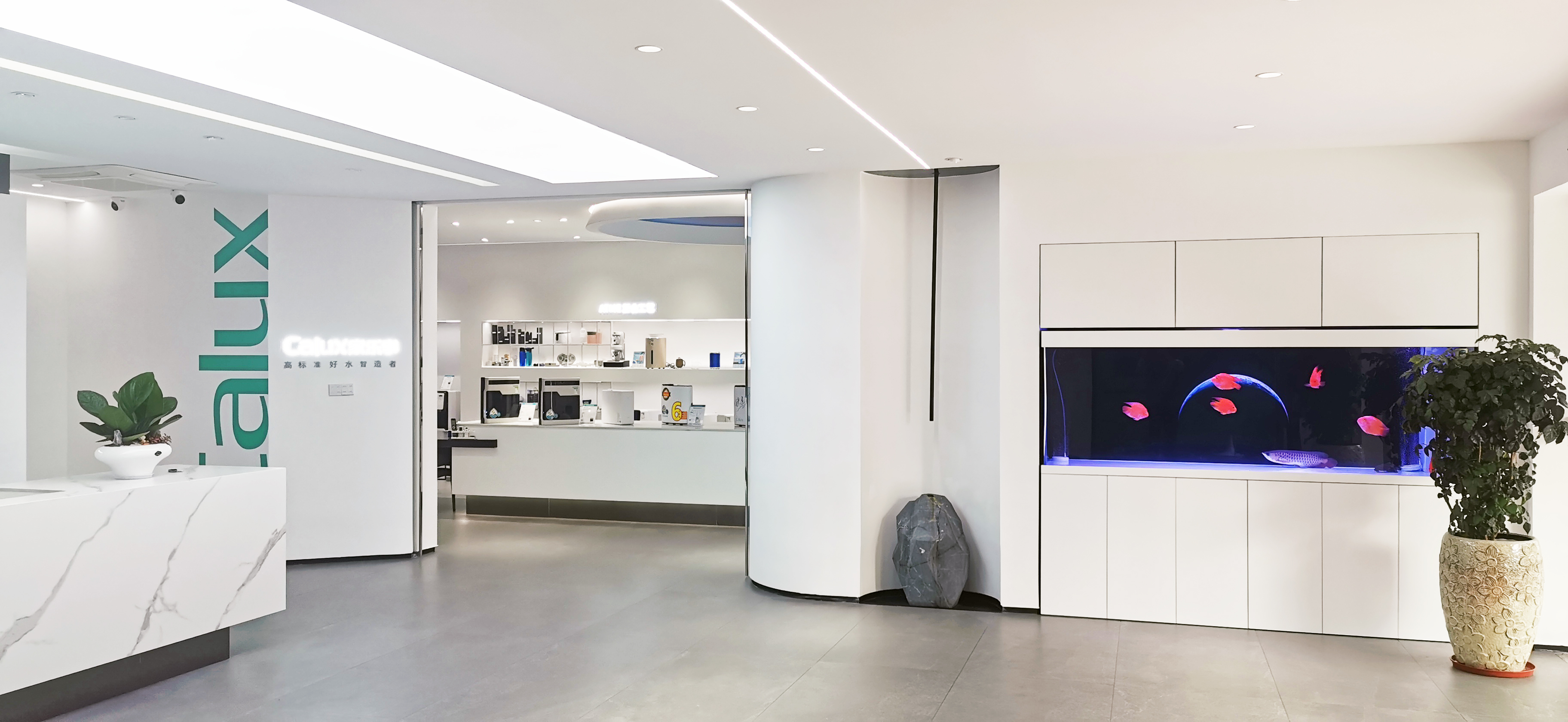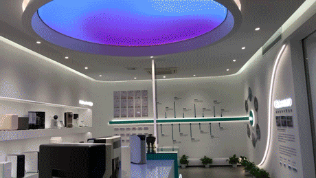 2023年4月底,家樂事全新設(shè)計裝修的接待廳與展廳正式完工。在藍綠紫的交相輝映中,在智能電控系統(tǒng)和創(chuàng)意科技產(chǎn)品的加持下,整個展廳充滿了現(xiàn)代極簡科技風(fēng),下面就讓編者帶您一起做一場“云參觀”。